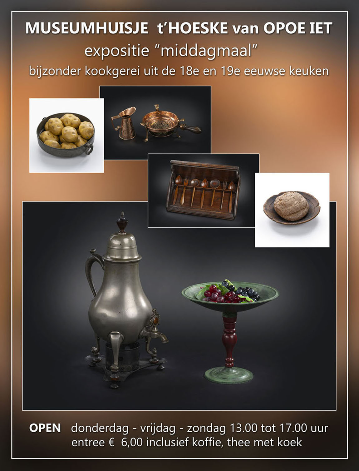 Van 10 april t/m 2 november 2025 is de expositie ‘Middagmaal’ te zien. Deze expositie toont authentiek kookgerei uit de 18e en 19e eeuw, zorgvuldig bewaard gebleven en geselecteerd om een beeld te geven van het koken en eten in een tijd dat eenvoud en zuinigheid de boventoon voerden.